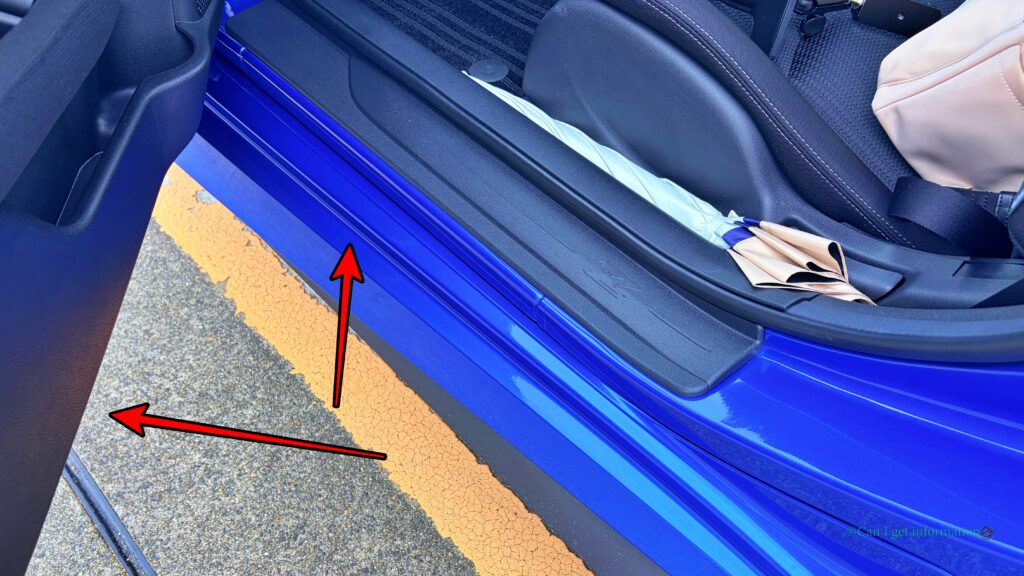 画像では分かりづらいですが、赤矢印のドアの縁とサイドステップの隙間にも汚れが溜まります。