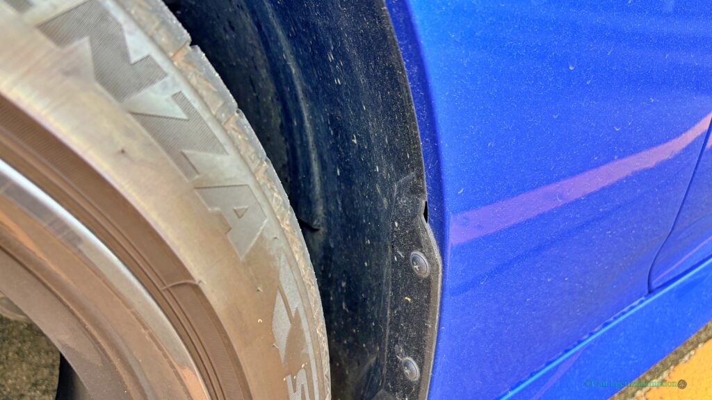 タイヤハウス内もしっかりとタイヤから直に巻き上げられた泥や枯葉が付着します。
