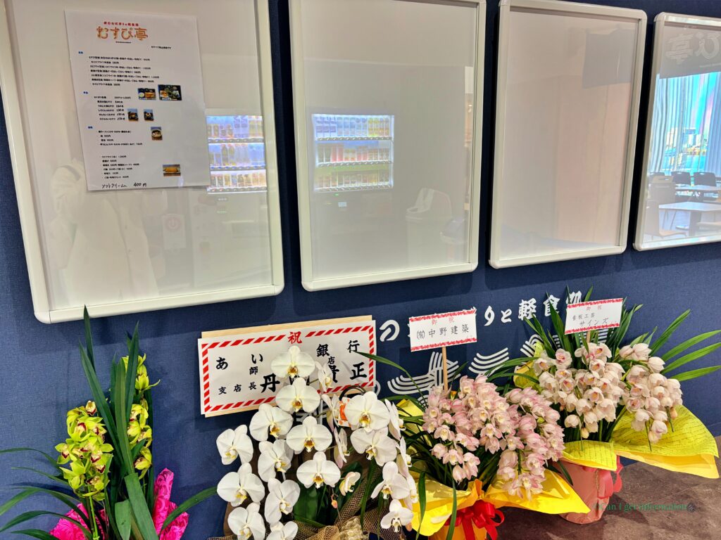 開業祝いのお花とむすび亭のメニューです。